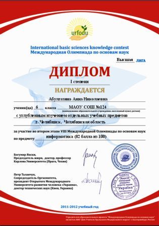 - Абулгазина Анна (6 класс) - участница второго этапа Высшей Лиги, набрав 82 балла, получила Диплом I степени высшей лиги VIII Олимпиады.