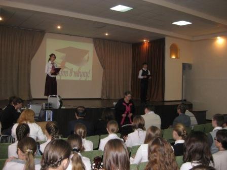 23 ноября в рамках мероприятий, посвященных 300-летию М.В. Ломоносова, в школе прошел традиционный праздник «Старт в науку!». Обучающиеся 10-х классов посвящали восьмиклассников в естественно-математические профили. Перед ребятами выступили гости – преподаватели ЧелГУ: Тюрин А.Г. (доктор химических наук, профессор, зав. кафедрой аналитической и физической химии), Вохминцев А.В. (кандидат технических наук, директор института информационных технологий ЧелГУ), Сташкевич Дарья Сергеевна (зам.декана биологического факультета ЧелГУ, кандидат биологических наук, доцент), Майер А.Е. (кандидат физико-математических наук, зав. кафедрой общей и прикладной физики). Они рассказали присутствующим о направлениях научной деятельности вуза. Собравшиеся принесли клятву верности выбранному профилю обучения. В заключение обучающиеся 10-х классов была предложена экскурсия в научные лаборатории ЧелГУ.