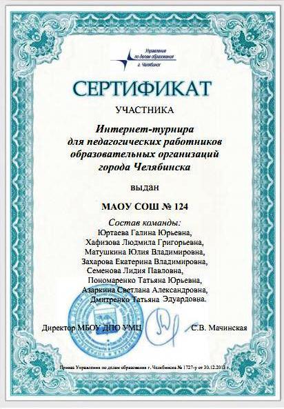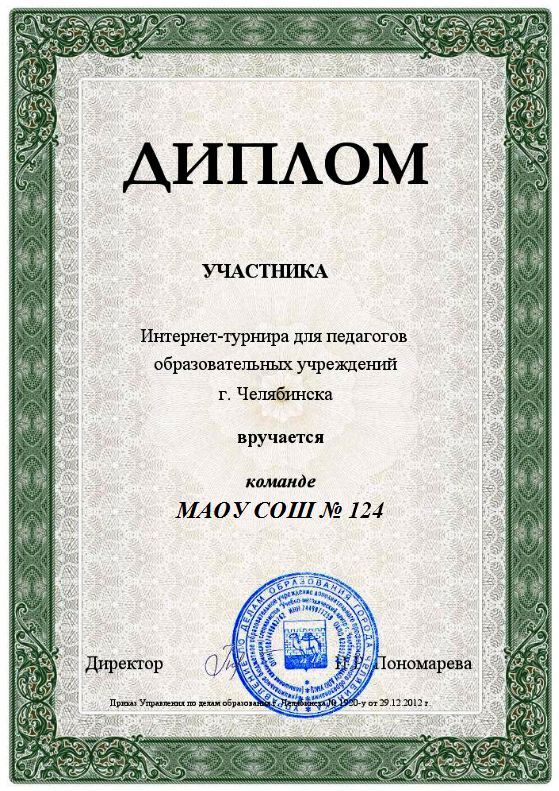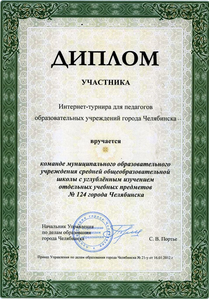 В 2011 - 2013 гг педагоги нашей школы принимали участие в Интернет-турнире, который проводился в целях повышения интереса педагогов к использованию современных информационно-коммуникационных технологий, поддержки и стимулирования развития творчества педагогических работников образовательных учреждений.