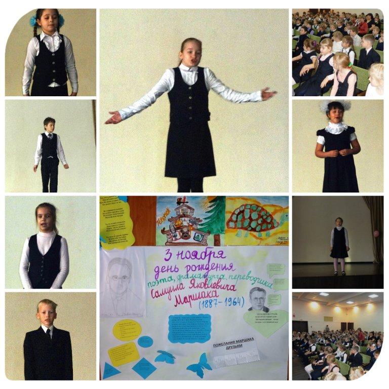 В конкурсе стенгазет «Творчество С.Я.Маршака» приняли участие 3-4-ые классы, 1-2 –ые классы участвовали в конкурсе рисунков «В мире сказок». В холле 2 этажа была оформлена выставка рисунков и стенгазет. Все классы параллели были отмечены грамотами за активность и яркие интересные работы.
