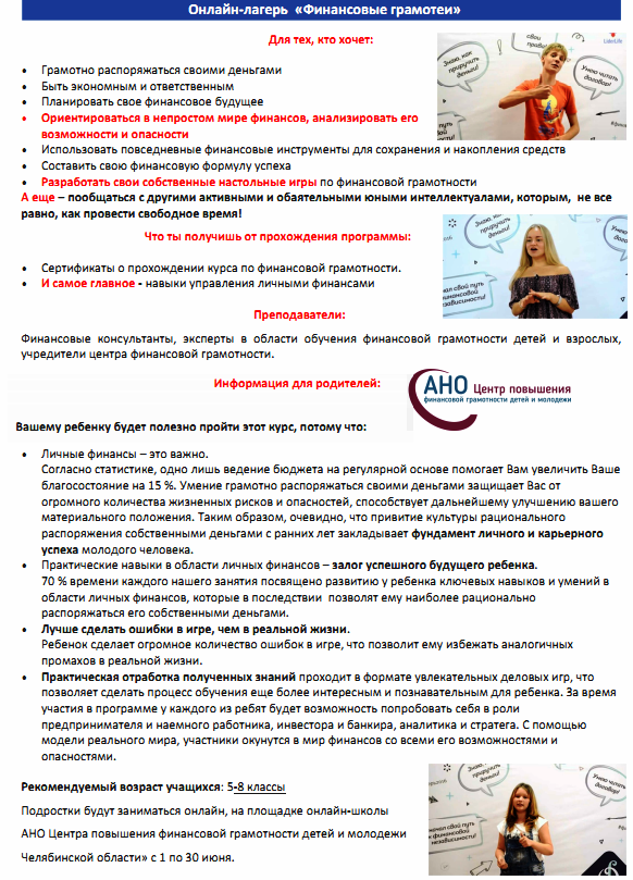 Программа онлайн-лагеря "Финансовые грамотеи"