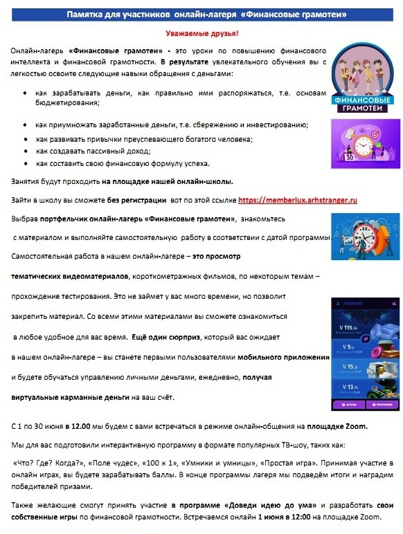 Занятия будут проходить на площадке нашей онлайн-школы, зайти по ссылке вы сможете без регистрации, так как доступ для вас открыт, заходите в портфельчик онлайн-лагерь «Финансовые грамотеи» вот по этой ссылке https://memberlux.arhstranger.ru и в соответствии с датой знакомьтесь с материалом и выполняйте самостоятельную работу.